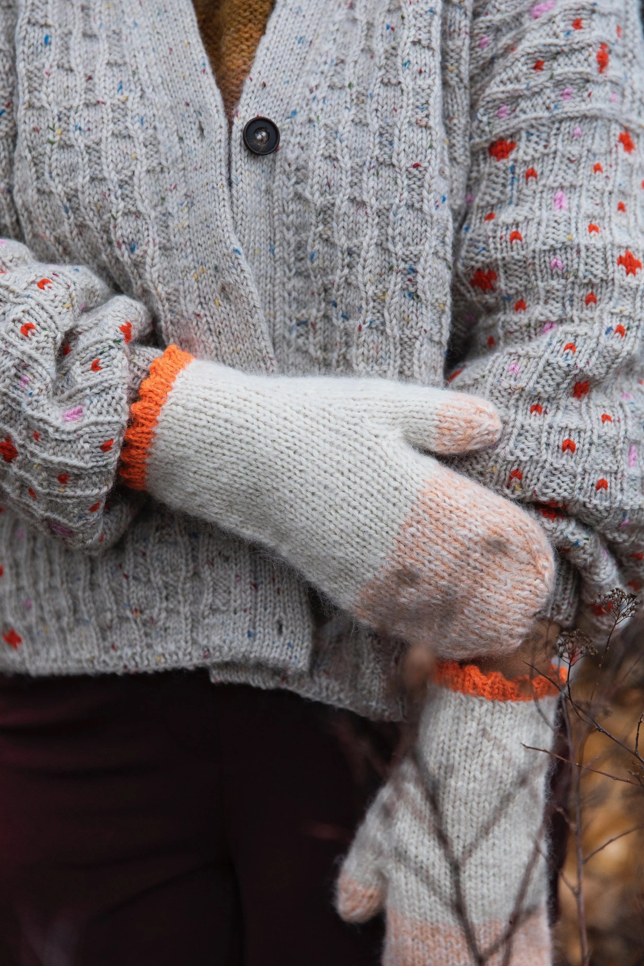 The sample pair was knitted in Biches & Bûches Le Gros Silk & Mohair. For the bright orange edge I used Purl Soho Linen Quill in the colourway Super Orange.